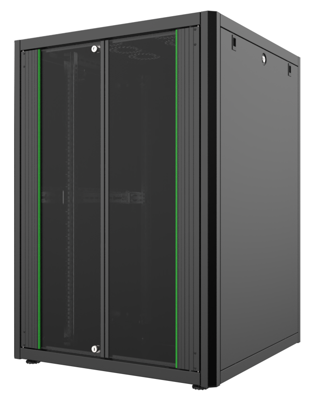 MIRSAN Szafa teleinformatyczna GTN 19″ 24U o wymiarach 800×800 mm, w kolorze czarnym, posiada jednoskrzydłowe drzwi szklane z przodu i pełne metalowe drzwi z tyłu. Idealna do średnich instalacji IT, zapewnia ochronę sprzętu oraz estetyczny wygląd.